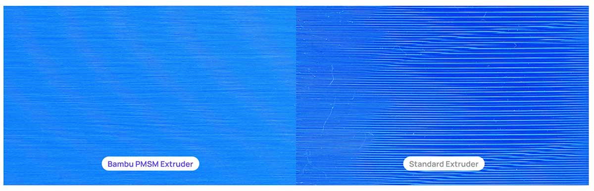 Extruder gears grind into filament as they feed it, causing small pressure fluctuations that show up as tiny lines on the surface. Exclusive to Bambu Lab, the PMSM servo system⁵ counters this in real time. With resistance and position sampling at 20 kHz, it adjusts electromagnetic torque on the fly, smoothing out every micro-fluctuation before it reaches the surface.