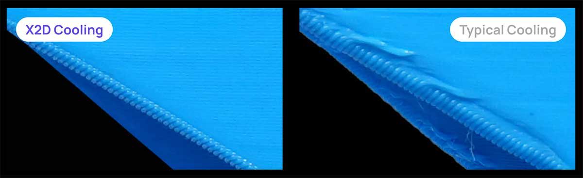 Two intakes are always better than one. Freshly extruded filament is soft, but the X2D instantly flushes the chamber with cool air from dual left and right intakes. This constant air exchange stabilizes each layer for low-temperature filaments like PLA, cooling every line at exactly the right moment. So even on tricky angles, overhangs stay sharp and bridges stay clean.